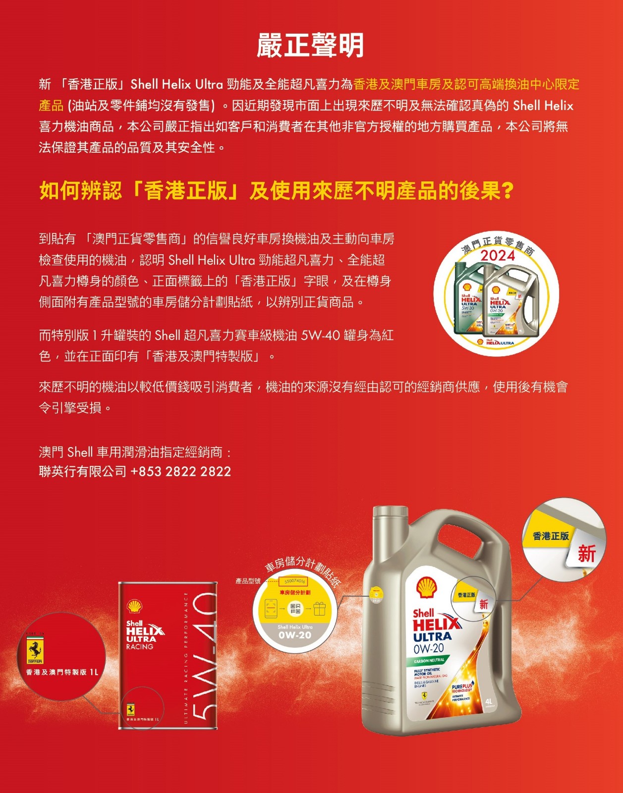 特級高性能全合成 Shell Helix Ultra勁能超凡喜力 香檳金包裝適合德國車系使用,認明 Shell Helix Ultra 勁能超凡喜力樽身顏色、以及「香港正版」標籤,能確保所使用的機油從廠房生產到進入引擎一刻都受到保障!