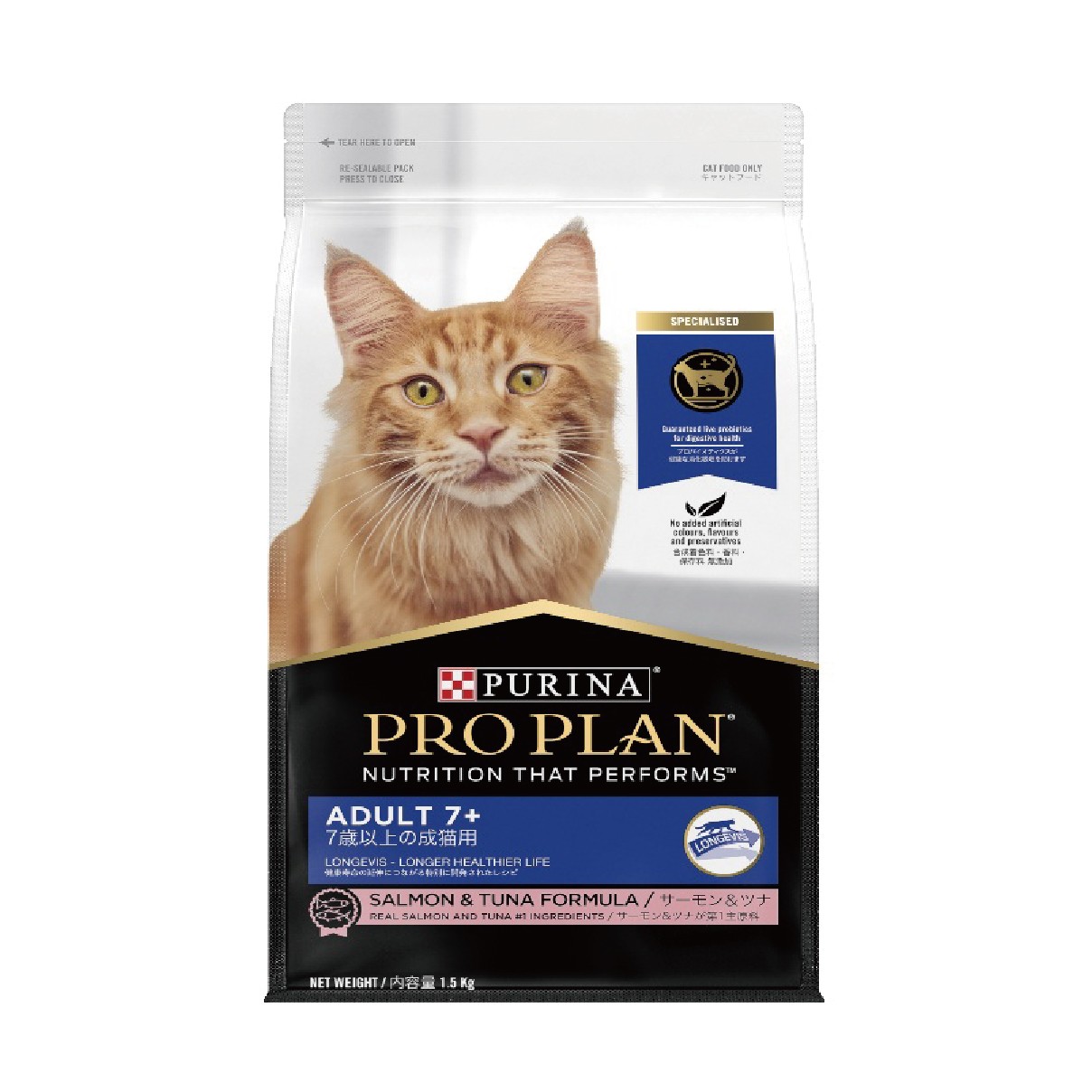 PRO PLAN®成貓7+配方(三文魚及呑拿魚) 含LONGEVIS獨特營養配方獲證實有助延長健康壽命,以及提升生活質素,並含抗氧化物,幫助增強免疫力,為7歲或以上貓咪帶來高品質的健康飲食。
