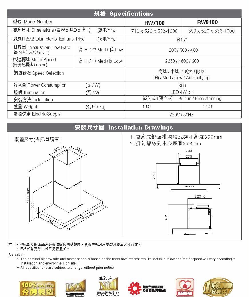 排風量(高H /中M /低L) : 1200 / 900 / 48 每小時立方米